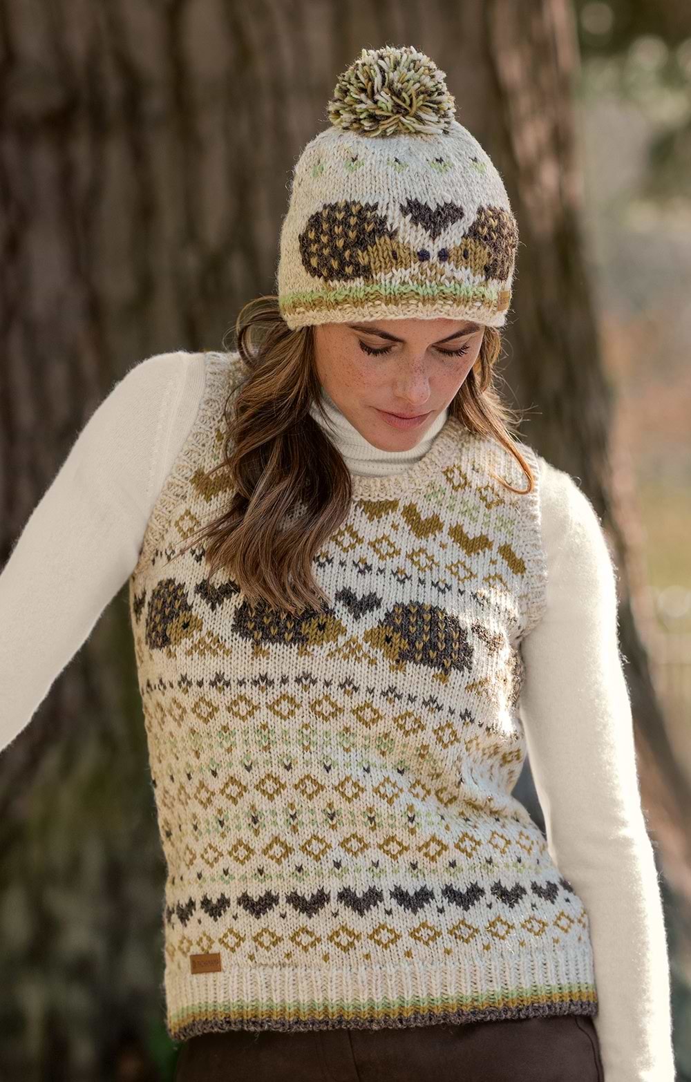 100% wool hedgehog vestAdorable hedgehog patternFair Trade and handmadeThe ladies Pachamama hedgehog tank is a must-have for those who love nature and ethical fashion.