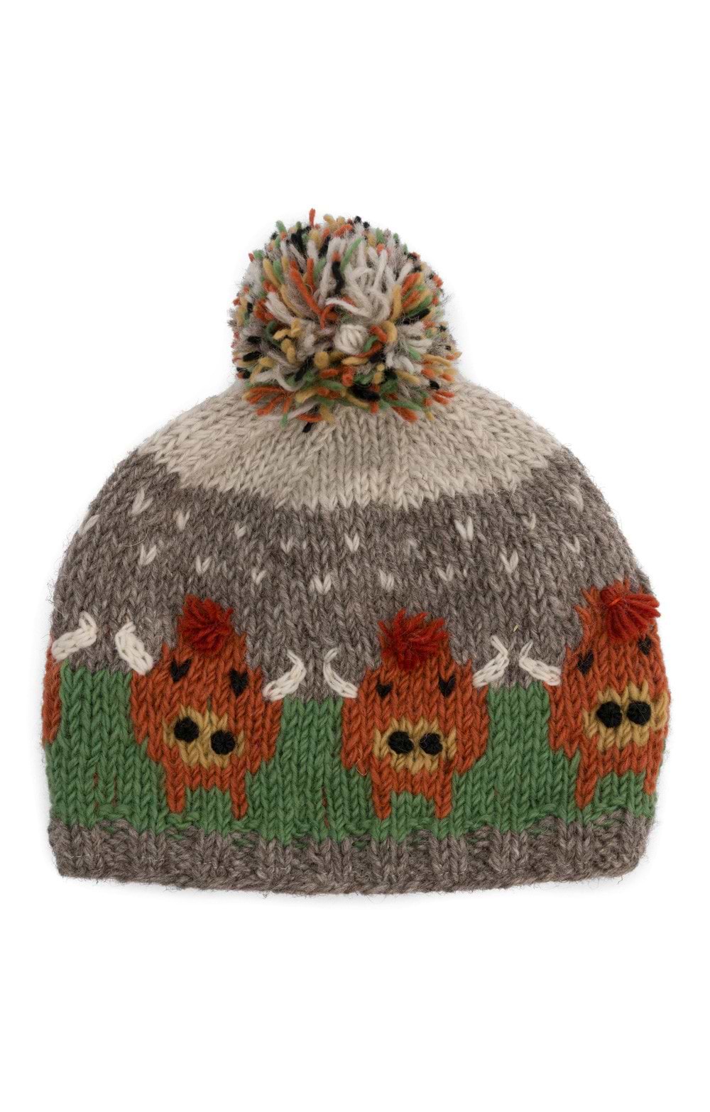 Scotland's other national beast, the iconic Highland cow, adorns this Pachamama pure wool Highland cow bobble beanie, making it the perfect gift.