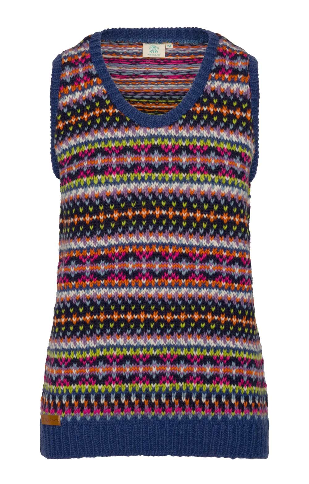 Fairisle pattern tankBold modern coloursHandmade in Nepal1 ply fine knit100% woolEmbrace luxury and style with the ladies Pachamama Iona tank top.