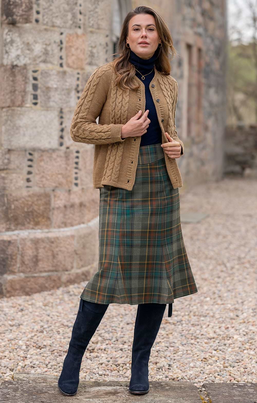 Pure new wool tartan skirtGently flaredFully linedTwo spacious side pocketsOne and three-quarter inch waistbandConcealed centre back zipWear with a cosy sweater and knee-high boots for a relaxed casual feel or style it with a crisp shirt and fitted tweed jacket for a polished look.