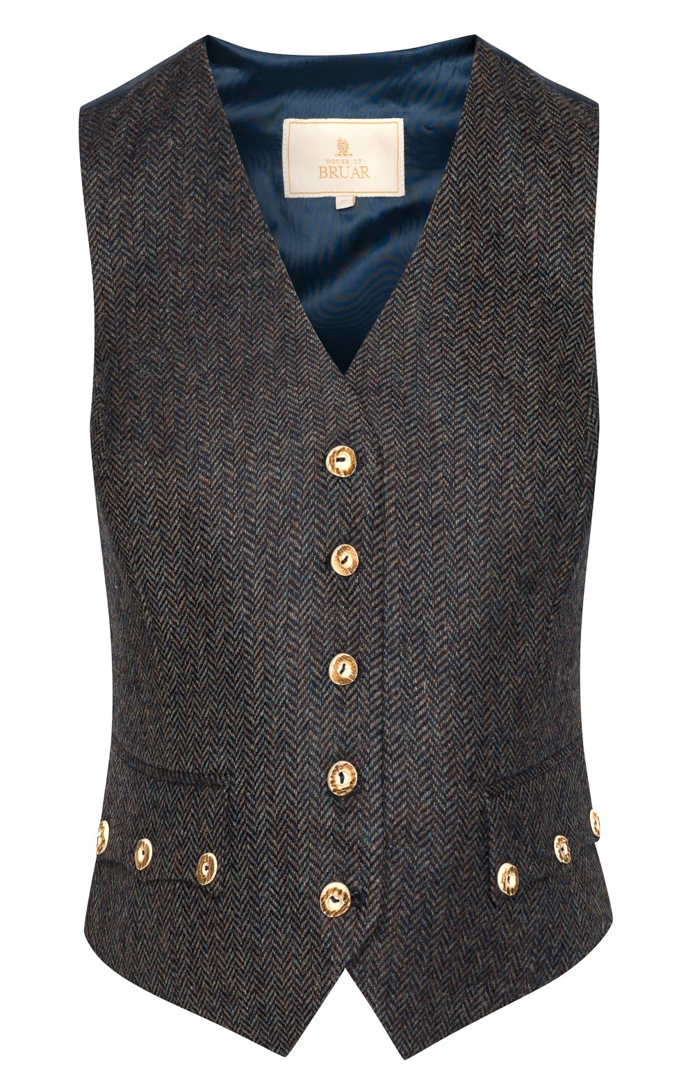 Traditional ladies waistcoat in British TweedAuthentic Highland details include mock horn buttons and triple button flap pocketsBack panel in coordinating colour with adjustable tabDesigned by The House of BruarIdeal for formal country or Highland-themed events, this superb waistcoat will also look great in more casual scenarios - team with a crisp oversized white shirt and wide leg trousers or even jeans to add style and individuality to your everyday wear.