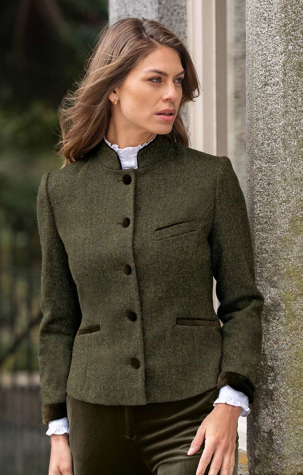 Tailored British tweed jacketNotched stand collarVelvet buttonsVelvet trims to the cuffs and welt pocketsVelvet tipping to the collar and chest pocketFully-linedA quiet star within our collection, this jacket will look superb with matching tweeds or velvets, or indeed with any coordinated trousers, providing endless wear within your country wardrobe.