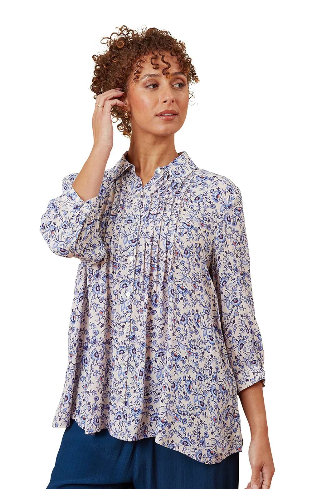 Adorned with a delicate floral print, this blouse features pintuck detailing through the front complemented by a curved hem and longline cut that enhances the fluid silhouette. A classic shirt collar and three-quarter sleeves introduce a note of gentle structure. From morning gallery visits to shaded garden lunches, this is a refined everyday piece with a light, considered finish.