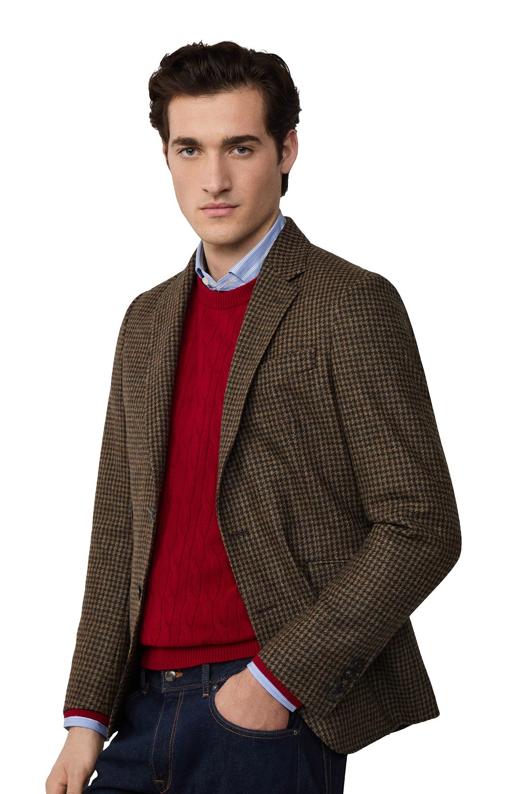 Notch lapels with two-button fasteningCompact houndstooth weave with refined textureFlap pockets plus chest welt pocketShaped waist for a clean silhouetteSmooth lining for comfortable layeringPair with a sky-blue Oxford shirt and dark denim for effortless weekend polish, or switch to flannel trousers and brogues for evening smartness.