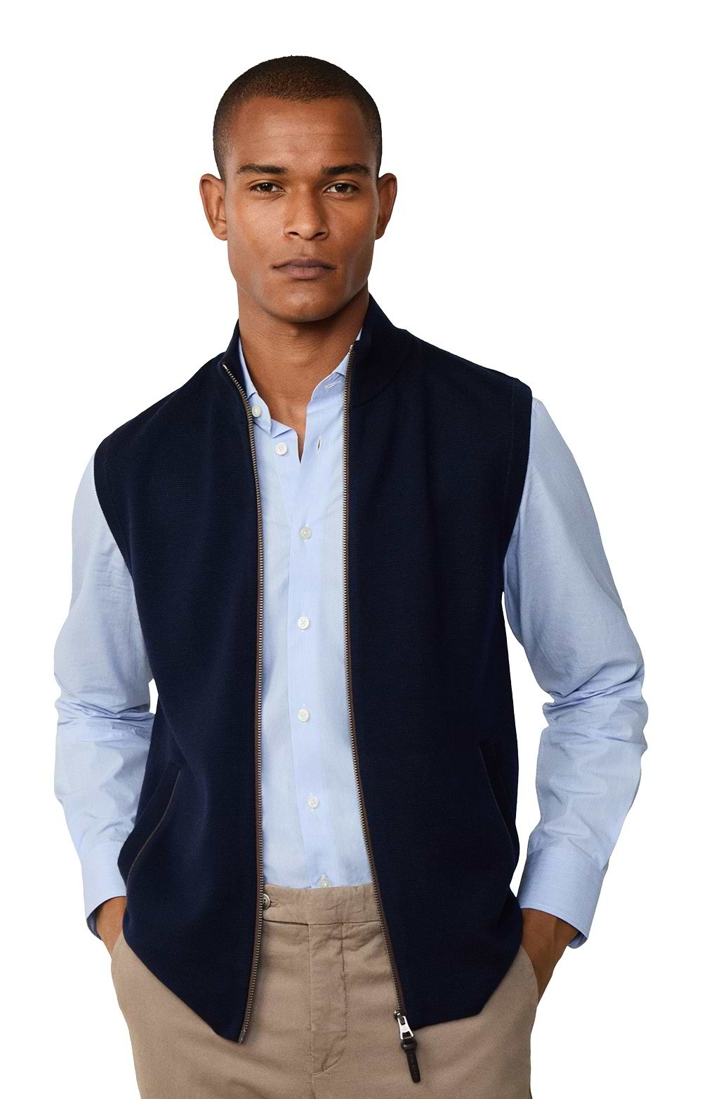 Made from 100% merino wool, it delivers both comfort and subtle lustre for a polished finish. The stand collar and double-ended zip provide a versatile look that works open or closed, while neat side pockets add understated practicality. Its compact Milano knit holds its shape beautifully, ensuring clean lines with every wear. Minimal finishing touches keep the style modern and adaptable. Whether you're dressing it up with a brushed check shirt for dinner or layering it over a tee for a relaxed weekend, this gilet offers endless styling potential.
