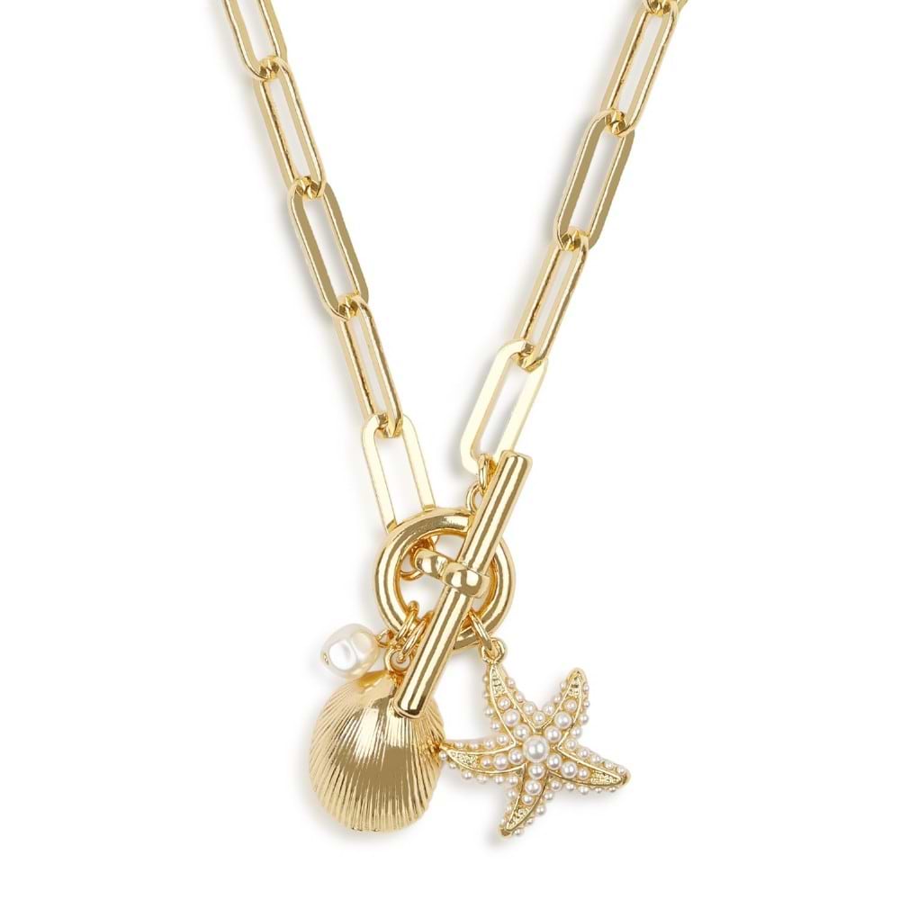 Delicate starfish and shell pendantOpen link chainT-bar front claspLightweight and comfortable to wearCarry a piece of the ocean with you or gift this enchanting necklace to someone special.