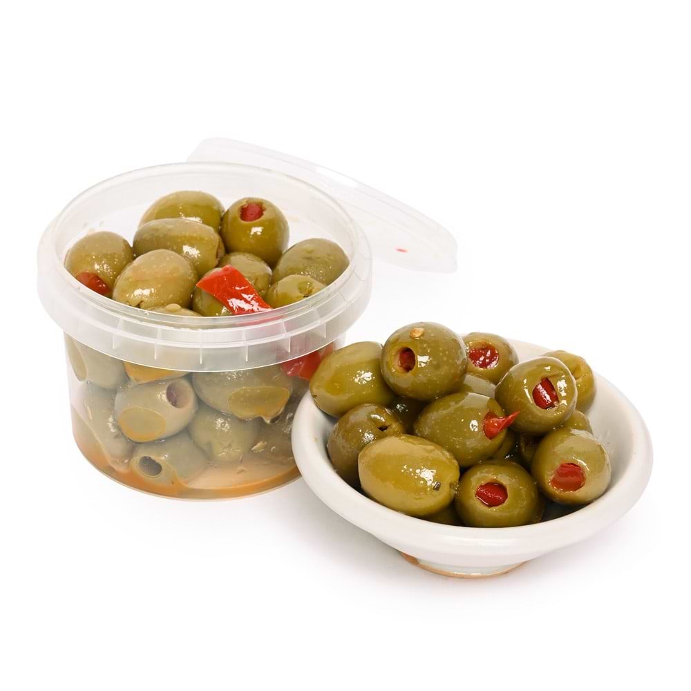 Green Olives, red Pimento peppers (Contains salt and traces of citric acid, lactic acid and ascorbic acid), water, sunflower oil