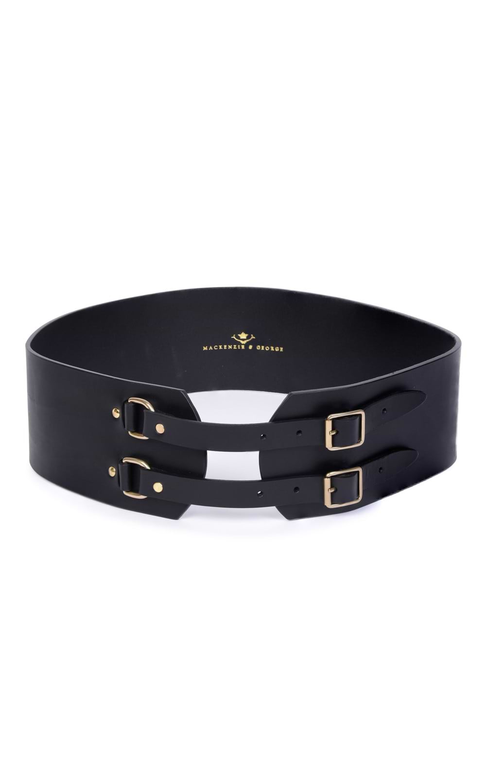 Wide belt with double buckle fasteningHigh quality leatherGold-tone buckle detailCinches the waistHand-crafted in the UKHand-crafted in Britain by Mackenzie and George, this piece is a must for any lady serious about country style.