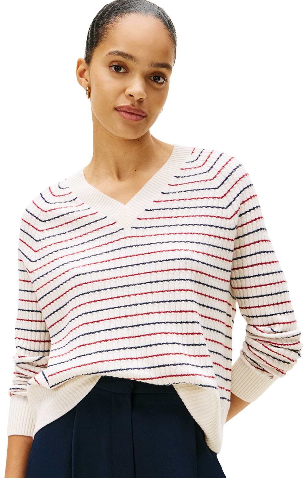 Cable-knit v-neck wool sweaterRaglan shapingWool-rich cashmere blendCable knitV-neckRib-knit collar, cuffs and hemTommy Hilfiger flag embroidery on cuffPair over a button up with tailored trousers for a trip to the office, or with jeans for a refined casual look.