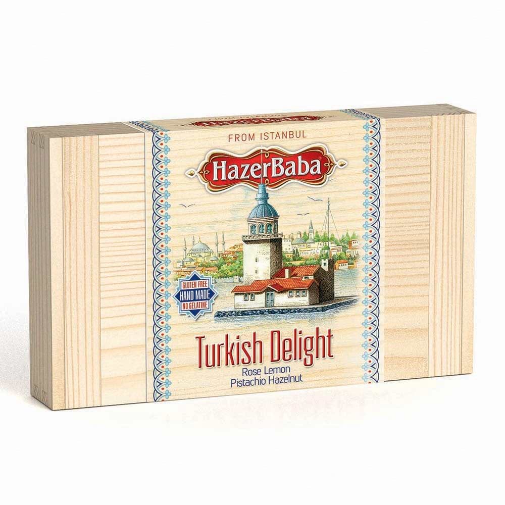 Made by traditional Turkish confectionery specialists Hazer Baba, this wooden box contains premium rose, lemon, pistachio and hazelnut flavoured Turkish Delight.